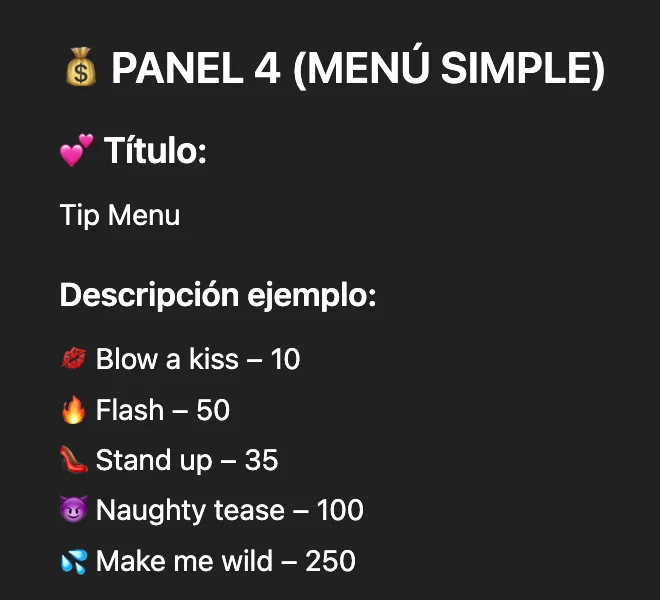 Odzadu, Erotický tanec, Koža, Lovense, Lush, Flexionar, Juego con Semen, Liquido Preseminal, Prstovanie, Dildo alebo vibrátor, Sprosté reči, Striptíz, Sexuálne hračky, Orál, Masturbácia, Medzi kozy, Olejová šou, Sedenie na tvári, SexMachine with 555 tTks, Tragar, Twerk, Striekanie